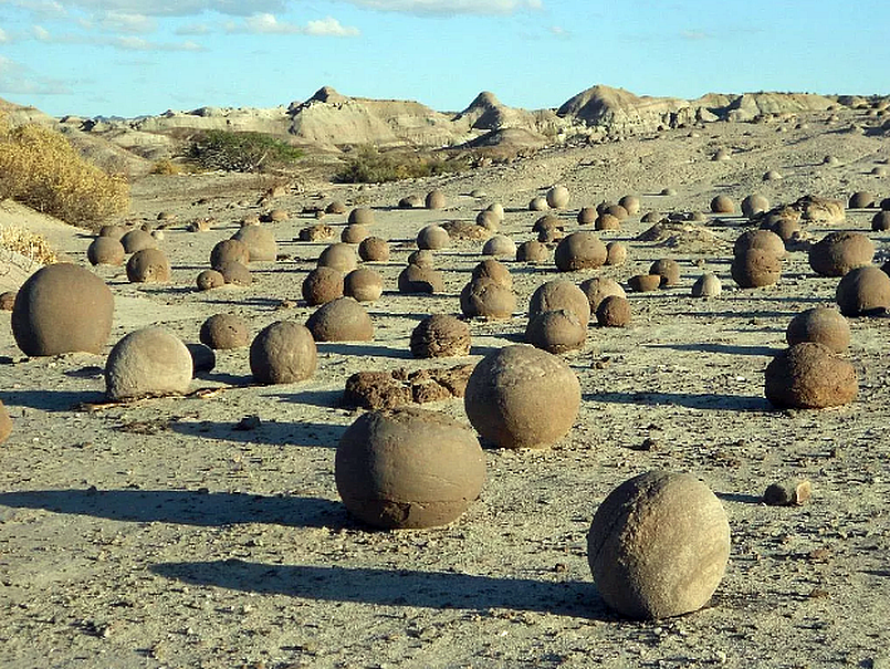 Один такой шарик, находясь в витрине музея, ещё и совершает полный оборот вокруг своей оси за 128 дней.... Однако, по мнению иных ученых, тут нет никакой загадки! "На поверку шары оказались не чем иным, как природными конкрециями, а желобки на них - оттисками слоев породы, в которой они выросли." А в витрине музея он поворачивается из-за вибрации здания. Про твёрдость и губчатое наполнение конечно ничего не говорится. Ну а зачем? Правда?