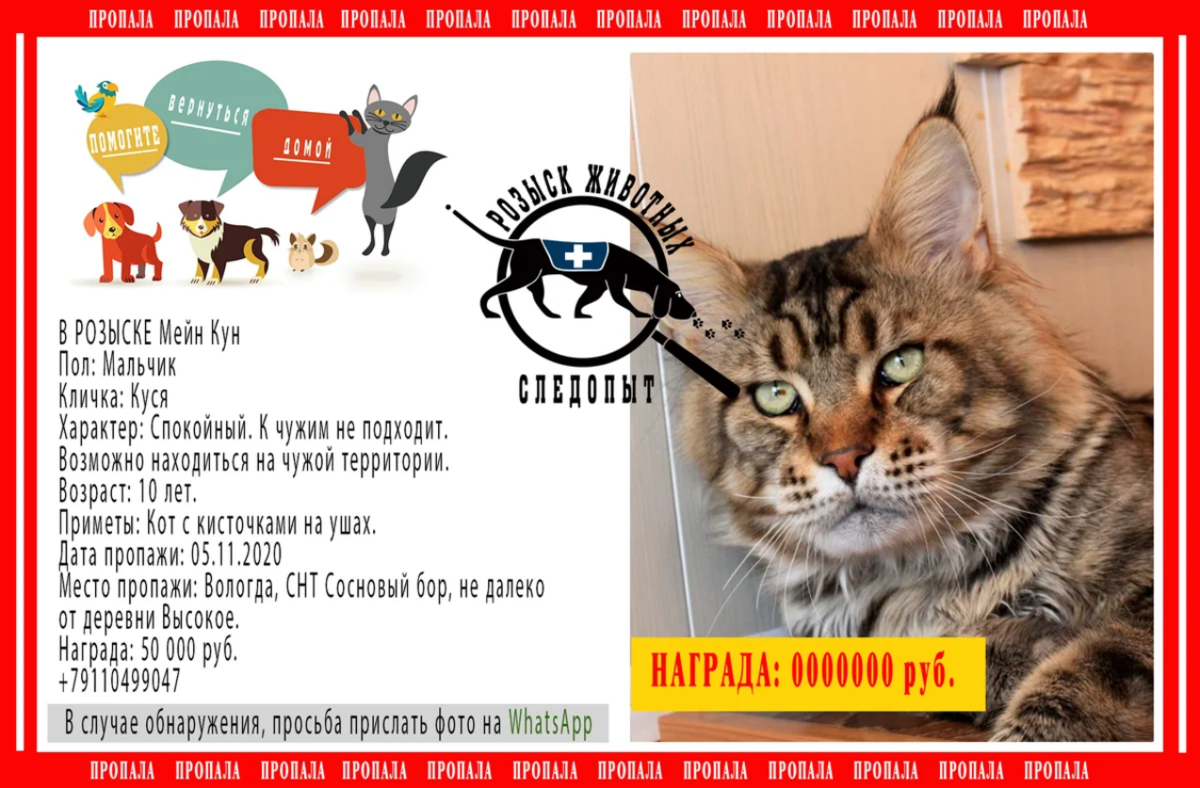 Награды за пропавших животных определяют хозяева, но иногда они могут быть более 100 000 руб.
