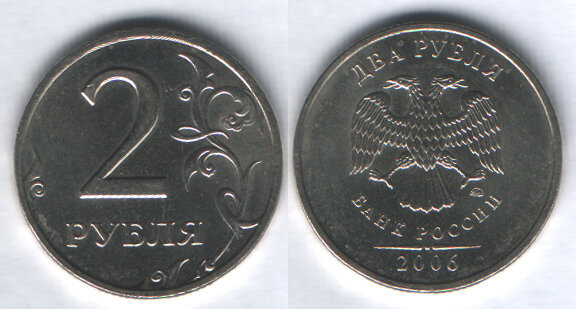 Итак, начну я с того, что вопреки распространённому мнению, 1 и 2 рубля 2006 года не являются редкими! Ценны они исключительно в идеальном состоянии и стоят не более 50 рублей в нём. Однако 2 рубля и вправду встречается реже 1, а так же имеют редкую разновидность. Особенность этой разновидности заключается в том, что завиток сильно приближен к канту.