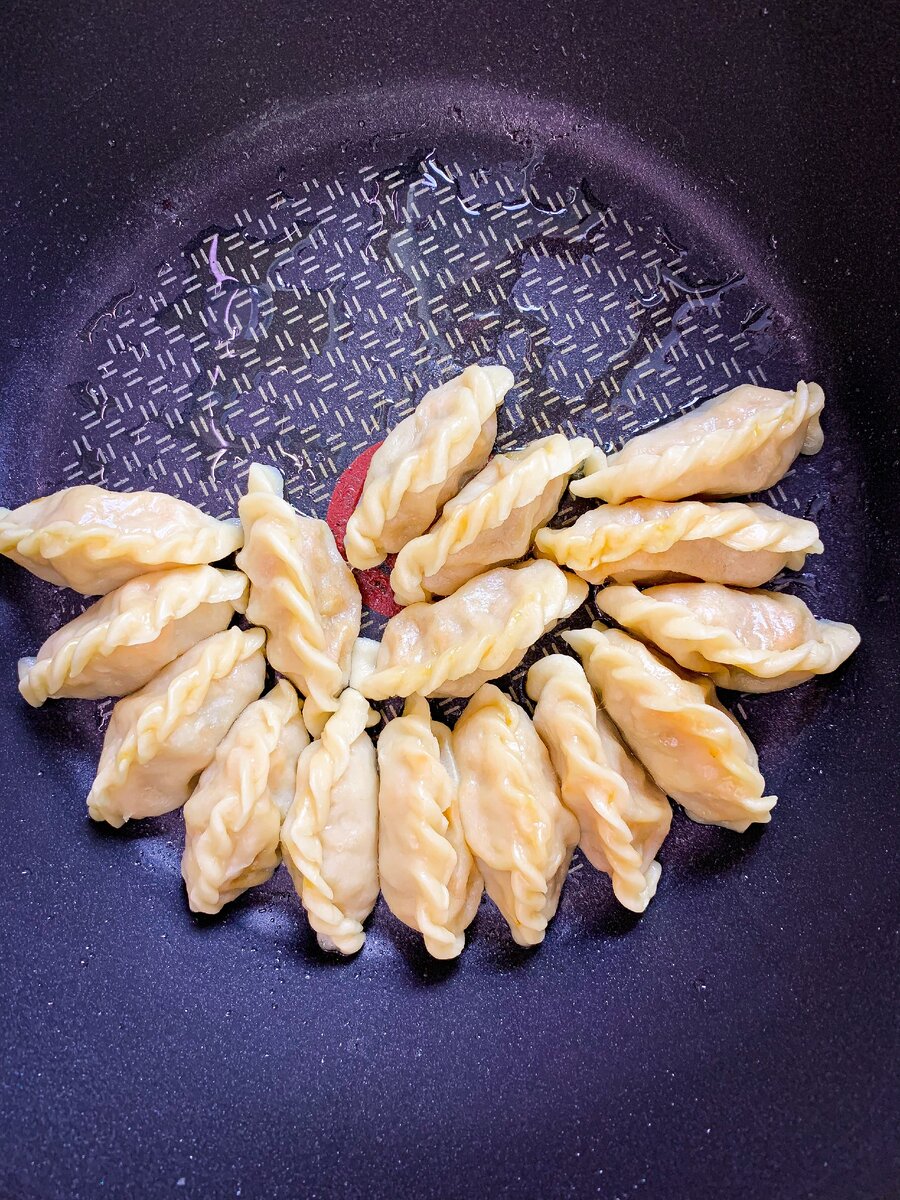 Тесто раскатать, вырезать кружочки с помощью формочки или стакана и слепить пельмени. На сковороде обжарить слепленные пельмешки, затем налить немного воды, накрыть крышкой и готовить 8 минут на среднем огне.
