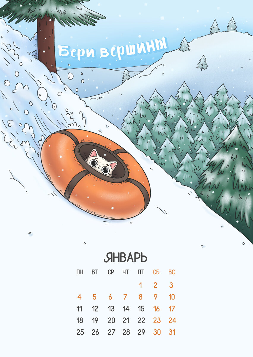 Привет! Сегодня хочу поделиться с вами работами художницы, которая сконцентрировала своё внимание на одних из самых милых представителях братьев наших меньших - на очаровательных котиках! Автор трудится и показывает свои работы здесь. В группе можно найти не только котиков, но и другую милоту. В том числе наших авторских "аленей". Календарь получился по истине пушистым и уютным. Как раз таким, который хочется повесить на стену и каждый месяц наслаждаться новой умилительной иллюстрацией. Давайте смотреть :) Январь Все иллюстрации мотивируют нас не сдаваться, а глядеть вперёд, иногда лениться, а иногда брать всё в свои руки. Таким образом январь очень символично советует "брать вершины", ведь как новый год встретишь - так его и проведёшь. И пусть у каждого нашего подписчика и читателя год начнётся с новых свершений! Февраль И вот, спустившись "на попе с горки", мы встречаемся с новым советом, который гласит, что важно оставаться собой. Надо отметить, что при всей серьёзности в нашей ж