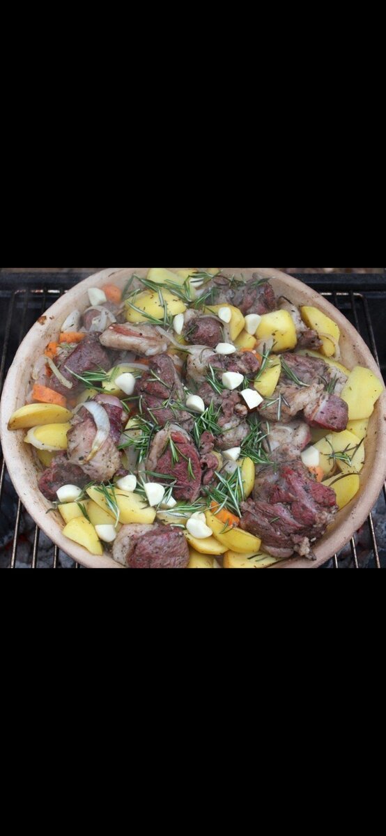 Выложить на сковороду баранину, желательно жиром вниз, для его лучшего вытапливания. Обжаривать мясо в течение 20 минут, периодически переворачивая. Порезать лук крупными полукольцами и высыпать на сковороду. Через 5 минут добавить морковь, порезанную кружочками. Еще через 5 минут – картофель, порезанный на 4 части и закрыть крышку гриля.