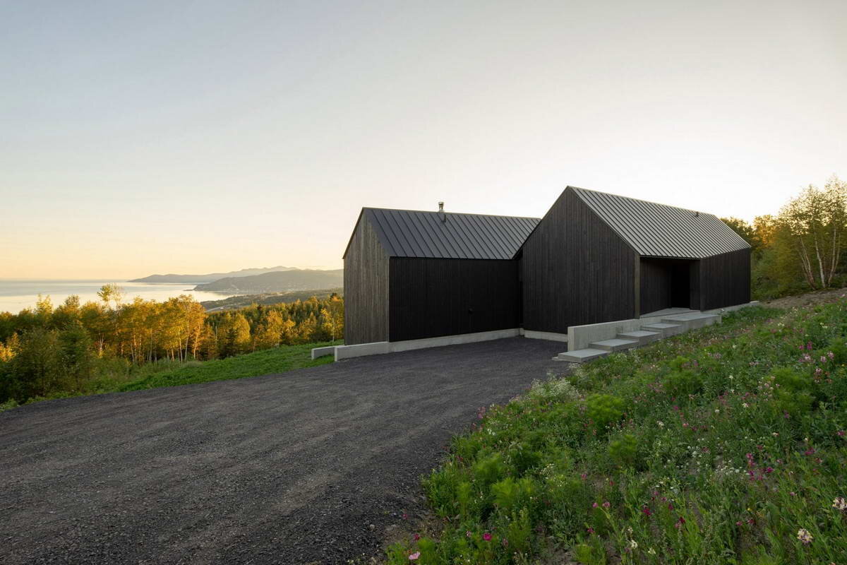 Этот эффектный, в меру минималистский, в меру традиционный дом построен на открытом живописном склоне в видом на залив Святого Лаврентия. По словам автора проекта, этот дом имеет деревенский вид, его архитектура более сельская, чем модернистская, ближе к земле, чем к небу. Два простых сомасштабных объёма с острыми двухскатными бескарнизными крышами и слегка искажёнными в сторону вытянутой трапеции планами, пересекаясь, сливаются друг с другом в единую композицию, закрытую с трёх сторон и открывающуюся в сторону видового склона и создавая общую форму, по словам архитекторов, «абстрактную и интригующую». Студия выбрала яркую палитру для интерьеров, создавая контраст со сплошными черными поверхностями легкими штрихами, такими как бледные деревянные полы, мебель и шкафы...