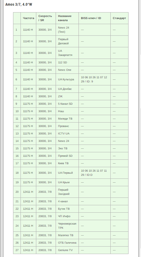 Объединенная таблица по трем спутникам - Amos, Astra (Sirius ) и Hot Bird