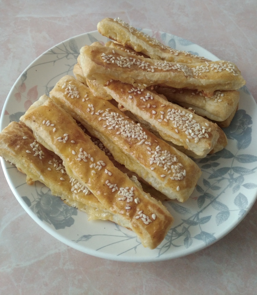 5. Выложить на противень застеленный пергаментной бумагой. Смазать яйцом и посыпать кунжутом. Выпекать при 200 градусах около 15 минут.