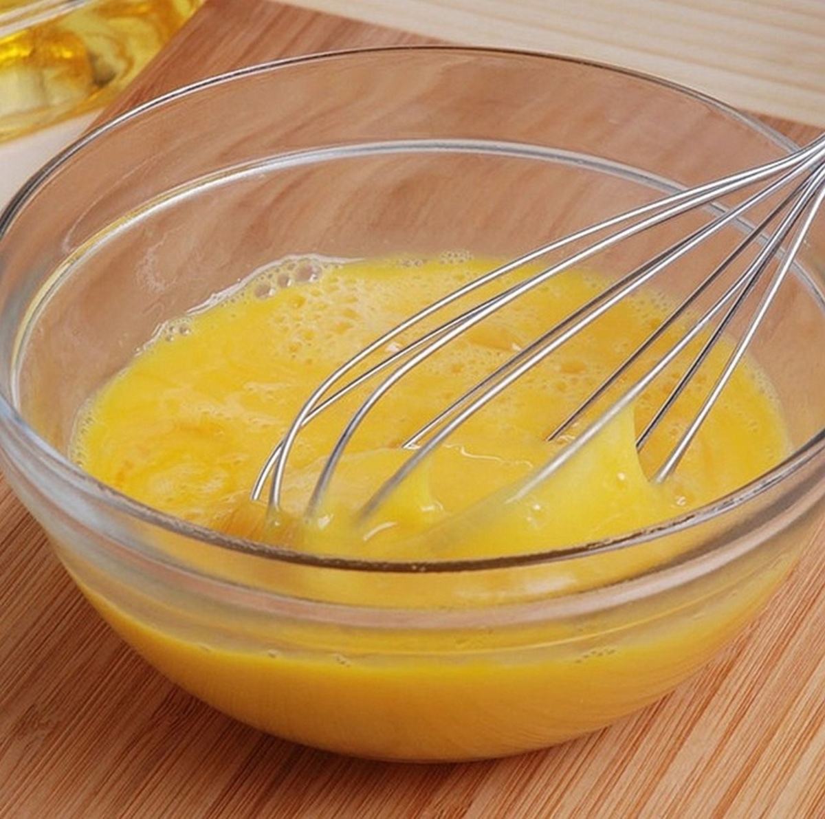 Яйца взбиваем венчиком. Добавляем соль и сахар.