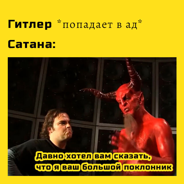 «МемПро» благодарит нашу банду подписчиков. Ваши лайки и репосты очень помогают развивать канал. А ваши комментарии просто радуют. Цель канала — находить актуальные мемы, рассказывать о них и поставлять в ваши Дзен-ленты хорошее настроение. Содержание: теперь наша подборка состоит из трех частей. Первая рассказывает историю интересного мема. Вторая — традиционная подборка на самые разные темы. Третья — невероятный факт, который предлагается обсудить в комментариях. Давно хотел признаться… я ваш большой поклонник Кадр, из которого получился шаблон мема изображает диалог мужчины с повелителем подземного царства. Здесь Дьявол что-то старательно объясняет своему собеседнику, а тот видимо находится под впечатлением от услышанного. На самом деле кадр достаточно нейтрален и лейтмотив этой серии мемов мог получиться любым. Как это часто бывает всю серию определил первый мем. Его автором стал slow_damage. На сайте reddit он опубликовал мемас где Гитлер попадает в ад и встречает Сатану, который