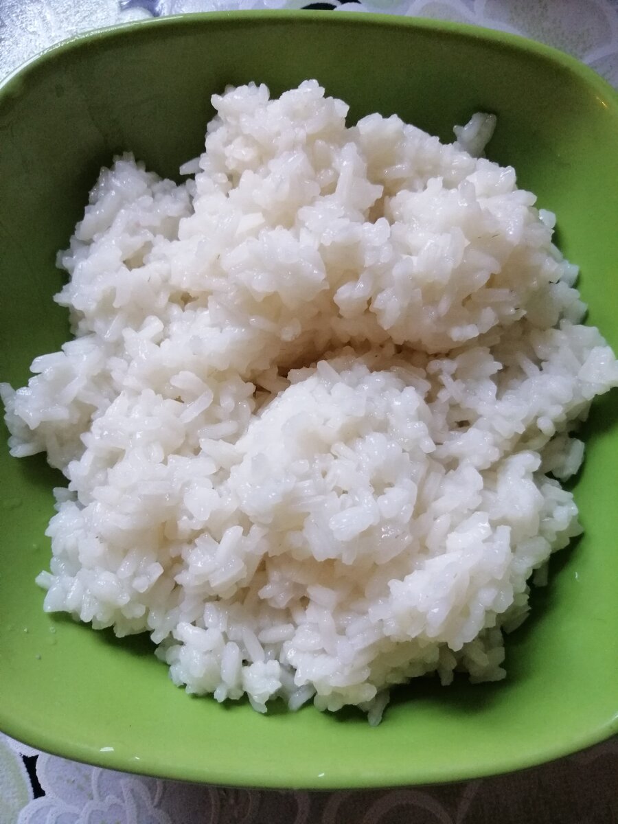 На дно тарелки выкладываем рис и промазываем его майонезом.