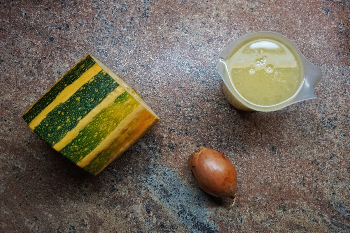 ⠀⠀Кабачок и лук режем на тонкие слайсы (кусочки). Чеснок давим ножом, чистим и мелко рубим. Кабачок, лук, чеснок вместе со сливочным маслом отправляем в кастрюлю. Добавляем куриный бульон, включаем плиту. После закипания варим на среднем огне 15 минут, периодически помешивая. Где то за пять минут до окончания этого времени наливаем в сотейник молоко и ставим его на плиту. Огонь средний.