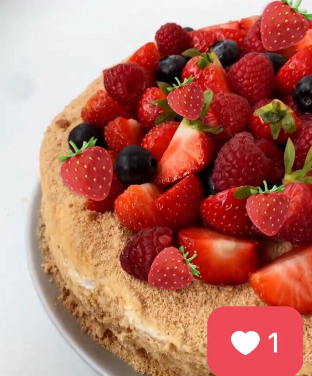 7. Собираем тортик: корж - крем - корж -крем по бокам и посыпаем крошкой со всех сторон, Украшаем ягодами и в холодильник.