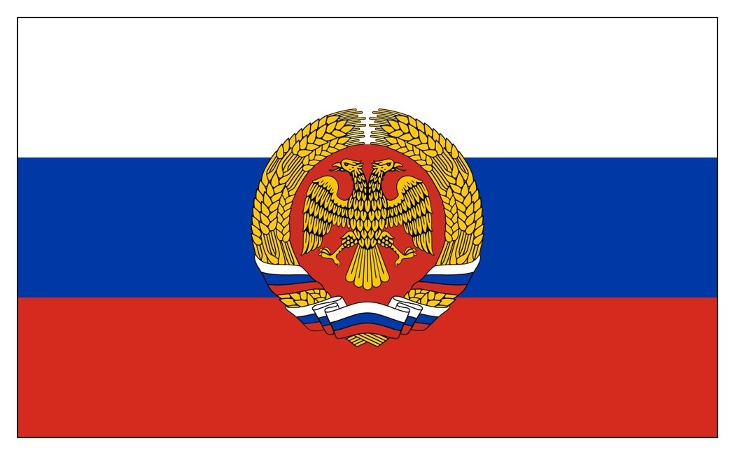 Российская Федеративная республика установилась после победы в Гражданской войне белого движения. На это непрозрачно намекает двуглавый орел "сим победиши" в крыже флага, который использовали силы Колчака. Но очевидно, что мир и спокойствие в государстве не установилось сразу. Об этом можно судить хотя бы по тому, что государственным устройством является федерация, что шло вразрез с планами Верховного Правителя возродить "единую и неделимую". Значит, либо власть пошла на уступки национальным окраинам, предоставив им автономии, либо в самом руководстве произошли изменения, и политический курс резко изменился. Об этом создатель флага нам не говорит.