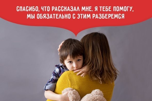 Первоочередная задача — успокоить ребёнка и обеспечить ему ощущение защищенности и эмоционального комфорта. Как бы ни хотелось при этом вскочить и побежать требовать обидчика к ответу и обвинять учителей. Последнее, в чём сейчас нуждается ребёнок, это раздражённый и взбудораженный родитель, который не может контролировать своё состояние. Дайте понять ему, что вы цените его откровенность. Для многих детей поделиться такой проблемой со взрослым — очень и очень непросто. Страх прослыть ябедой или усугубить ситуацию, неуверенность в себе, нежелание разочаровывать и расстраивать маму или папу, стыд — всё это часто мешает открыться.