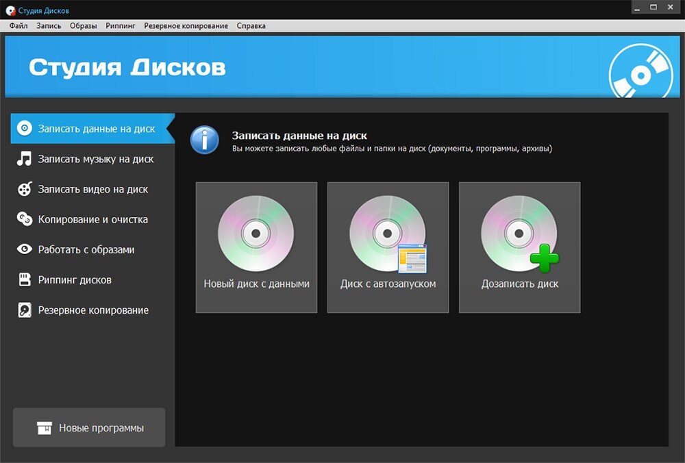 С помощью программы «Студия Дисков» можно записать на диск любую информацию быстро и эффективно. Сохраняйте документы, музыку, видео, программы, инсталляторы игр и другие файлы на диск одним кликом мыши! Продукт позволяет записать новый диск с нуля, дозаписать данные, а также создать диск с автозапуском. Кроме этого, в «Студии Дисков» удобно производить резервное копирование информации на ПК, чтобы избежать нежелательной потери файлов (например, в случае отказа системы или вирусной атаки).