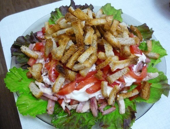 Помидоры остаются свежими. Все укладываю на плоскую тарелку слоями. Я кладу сначала обжаренное филе, потом половину помидор, чтобы курица пропиталась соком, следующий слой обжаренная ветчина, все промазываем заправкой майонез, аджика и чеснок, затем выкладываю остальную часть помидор. Сверху перед подачей на стол горкой гренки.