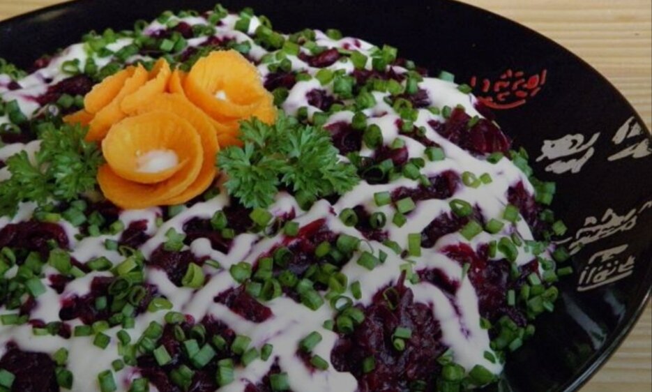 Последний слой - свекла. Украсьте майонезной сеточкой салат.