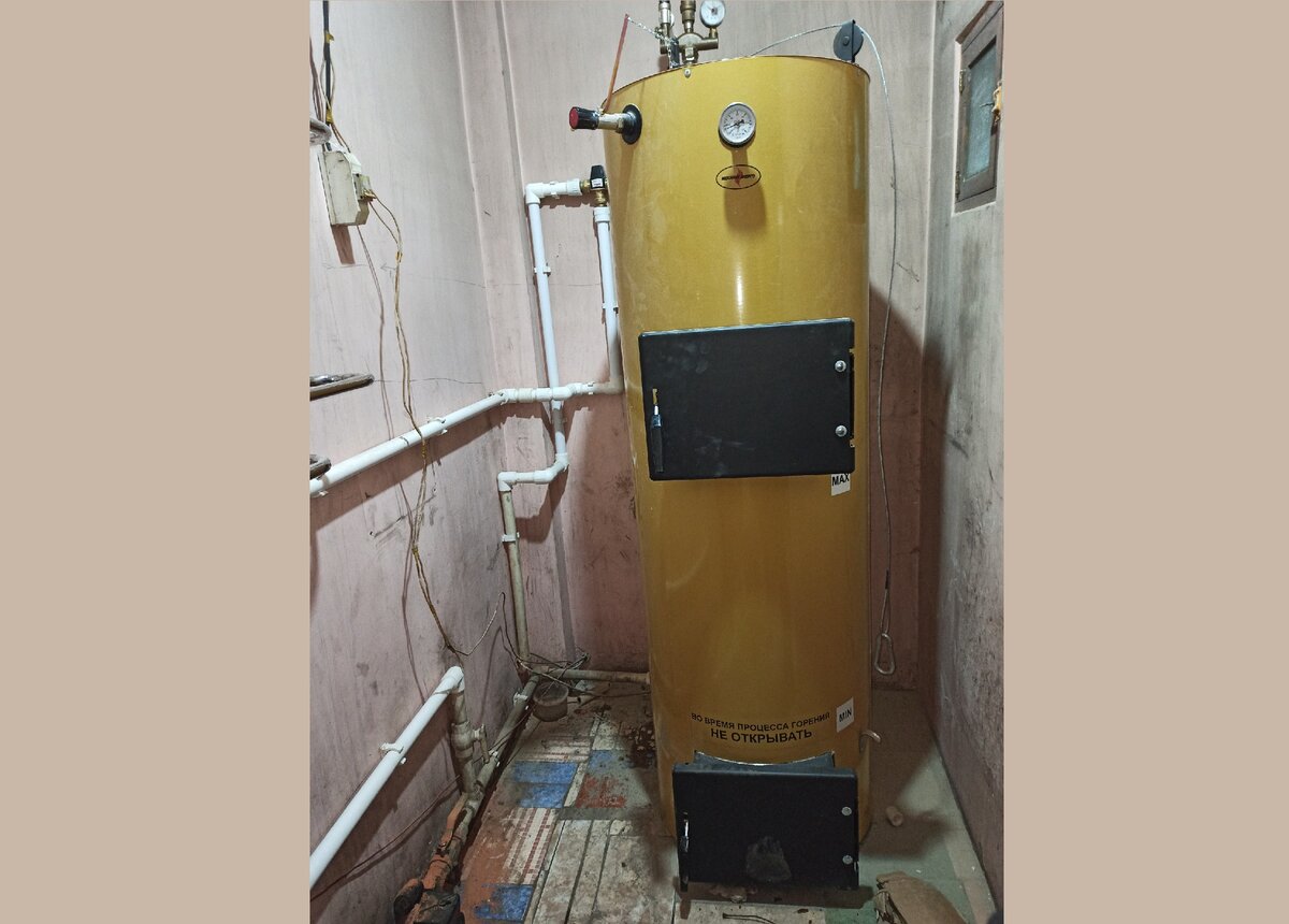 Котёл просто огромен, его высота 185 см, а вес 220 кг! Кое-как затащили его в небольшое помещение котельной и стали подключать. Тут оказалось всё намного проще — его можно обвязать как металлом, так и обычным полипропиленом, как я и сделал!