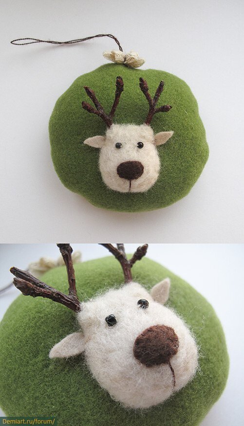 3. Отделяем от шерсти тонкую полосочку, делим напополам и обматываем основание рожек. Затем приваливаем, держа иглу примерно параллельно рожкам, как показано стрелочками.