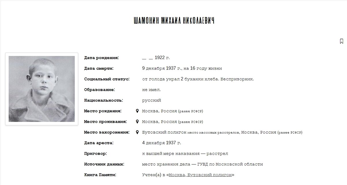 Со страниц поисковика на меня обрушились слезные статьи про то как Сталин таки расстрелял бедного подростка Мишу Шамонина которому оказывается было 13 лет, но подлые следователи приписали парню два года и конечно расстреляли. Про "расстрел" написали как просто блогеры, так и целые издания типа "Новой газеты", а портал о жертвах политических репрессий Бессмертный барак даже разместил вроде как исчерпывающую инормацию