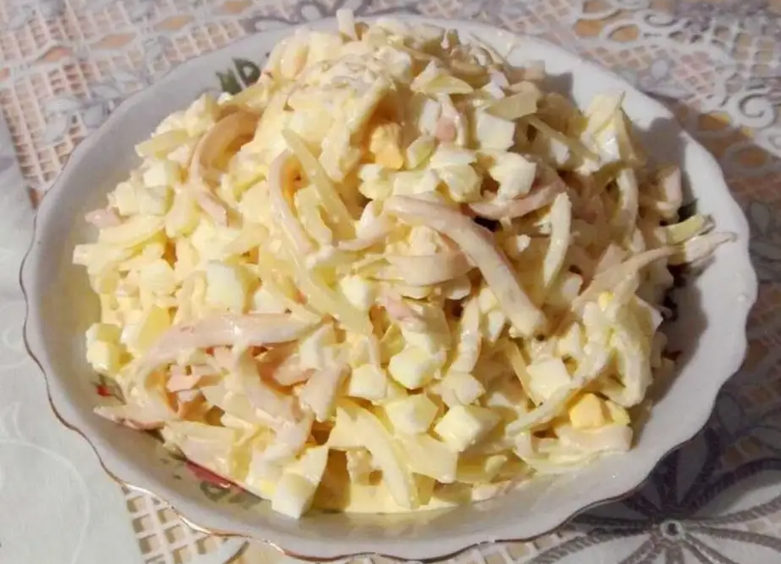 Салат с кальмарами и яйцами - закуска сытная, нежная, с нейтральным вкусом. Кальмары и вареные яйца хорошо сочетаются с другими продуктами. Салат с кальмарами, подойдет и для праздничного стола, и для ежедневной трапезы. Очень вкусно и просто!