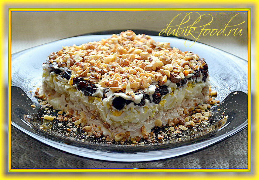 Изумительный, необычный салат с курицей, черносливом и орехами!