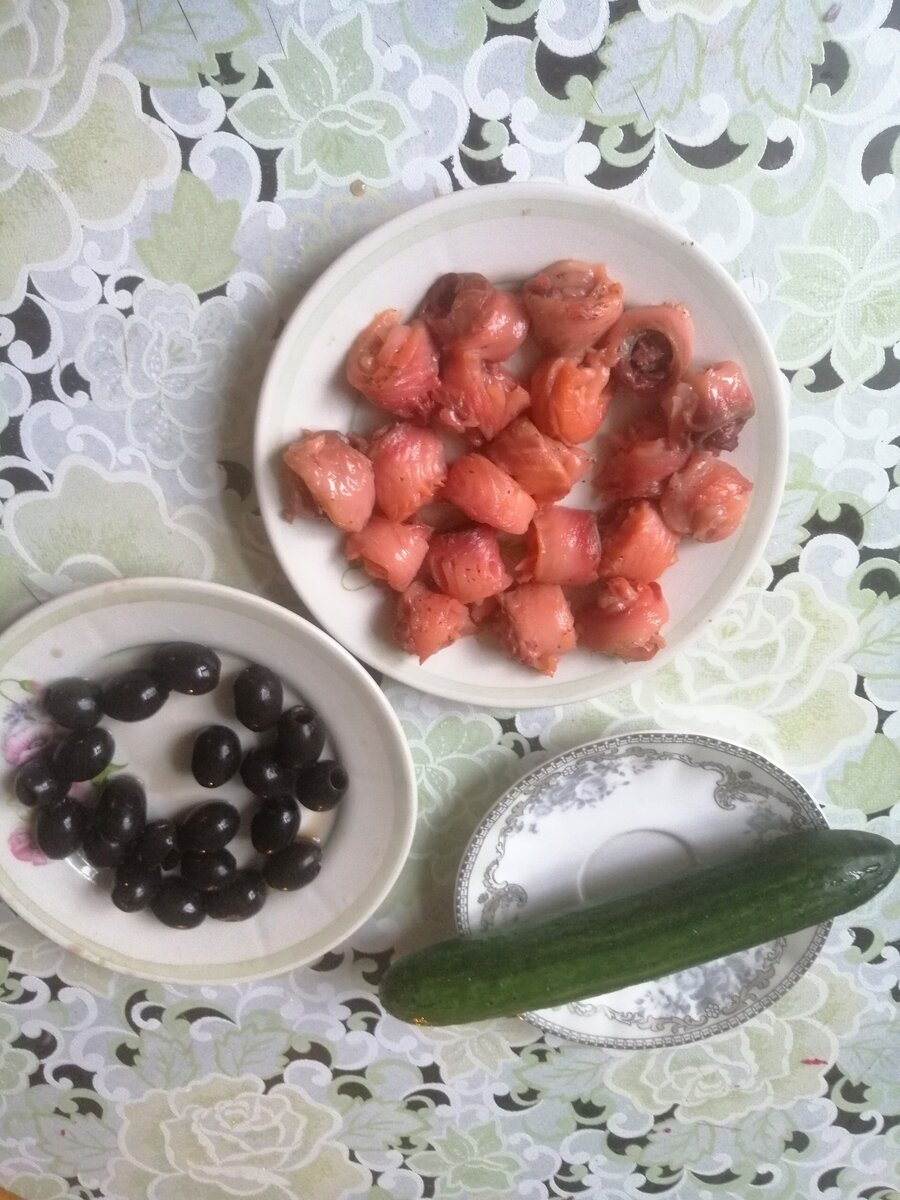 Для нее нам понадобятся один свежий огурец, маслины, малосольная красная рыба и шпажки)