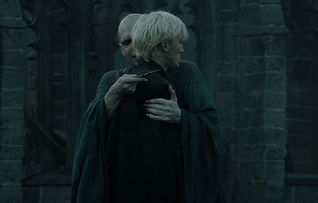 Во время короткого перемирия и после самопожертвования Гарри Поттера Волан-Де-Морт со своими Пожирателями подходит к стенам Хогвартса, чтобы объявить о своей победе. Он призывает всех защитников перейти на его сторону, но никто не выходит, стоит тишина, среди которой семейство Малфоев зовет Драко к себе. Драко, понимая, что это неправильно, все равно выходит из толпы защитников Хогвартса и идет к своим отцу и матери. Но на пути встает Волан-Де-Морт, который совершает странный поступок - он обнимает Драко, что совсем ему не свойственно. И все, включая Драко, это понимают. Молодой волшебник стоит, не шелохнувшись, пока Волан-Де-Морт пытается нелепо объять его своими руками. Именно это объятие и было импровизацией Рэйфа Файнса, который исполнил роль Волан-Де-Морта. Этот момент был полностью оправдан, ведь такого жеста испугались не только персонажи фильма, но и зрители, ведь от Волан-Де-Морта можно было ожидать чего угодно в любую секунду.