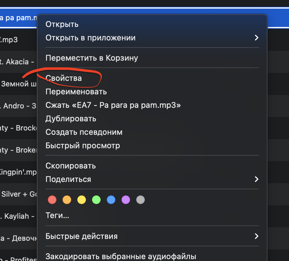 Вызываем контекстное меню у нужного нам файла, в данном примере возьмем файл .mp3 и дальше открываем свойства