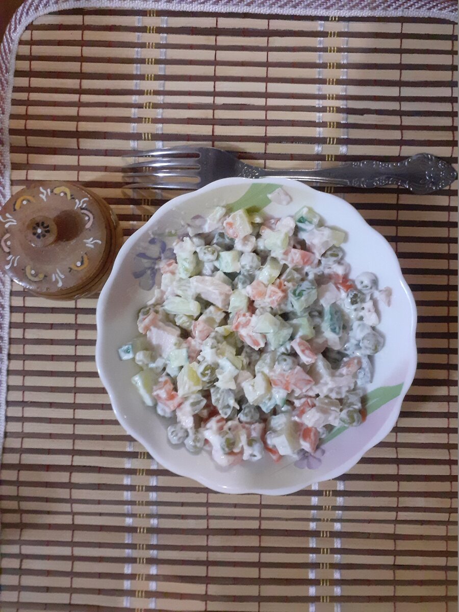 Всем привет! Внешне этот салат похож на оливье, но по вкусу он совсем другой, хоть в нем и присутствуют некоторые ингредиенты. Отведала я этот салат очень давно, когда была на летней практике в кафе. Салат этот готовили в "холодном цехе" в огромном количестве , т.к. он шел и на бизнес-ланч и на "цеховое" питание для сотрудников и расходился он махом. По вкусу этот салат сразу завоевал мое сердце, он имеет нежный сладковатый вкус, в который вклиниваются свежие нотки огурчика и пикантность маринованных корнишонов , а остальные ингредиенты уравновешивают вкус салата. Готовить не сложно, продукты все доступные и получается очень вкусный и сытный салатик. Самое главное соблюдать правильные пропорции ингредиентов и тогда получается... тот самый "волшебный" вкус. Подать его можно , как на праздничный стол, так и на семейный обед, он будет уместен везде. А теперь, делюсь с вами рецептом!