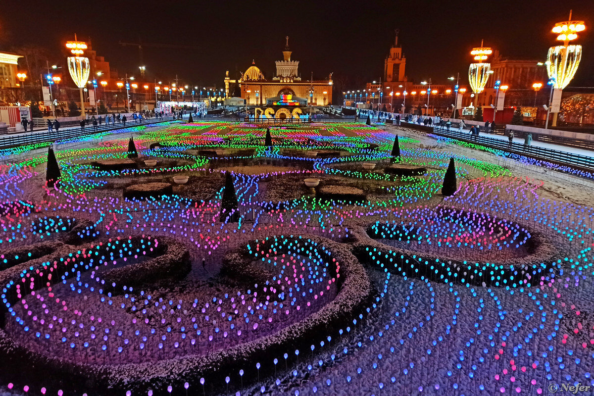 Светящиеся одуванчики качаются на ветру и меняют цвет. Больше всего света от главного входа до центрального павильона: колонны, деревья, коридор из ажурных арок. Поражают световые поля. К каждой лампочке протянут провод! А их около 70 тысяч!!!