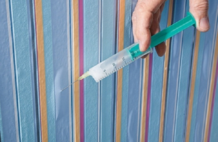 - Если после работы все-таки остались пузырьки воздуха, наберите клей в обычный медицинский шприц. Проткните вздутие и постепенно выдавливайте смесь. Обои размокнут и их можно будет разгладить.