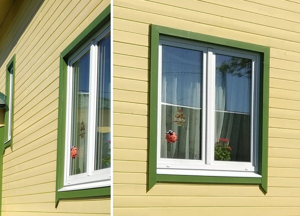 С наружной стороны мы применили очень простую технологию, называемую «четверть». Я купила брусок 50х50, покрыла его той же, что и фасад, грунтовкой, затем укрывной краской в цвет будущего наличника. Укрепили мы брусок вдоль откосов заподлицо с фасадом. Окно в проеме мы заблаговременно установили на 5 см. вглубь, на которые как раз пришлась внешняя отделка имитацией бруса, вентзазор и слой изоплата. Стык фасада и бруска прикрыли деревянным наличником.