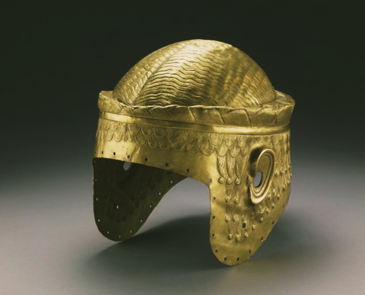 Город Ур-один из древнейших шумерских городов древней Месопотамии, основание которого относят к IV тысячелетию до н. э. Он располагался на юге современного Телль-Эль-Мукайяр в Ираке и существовал от первых шумерских царей (III тысячелетия до н. э.) до эпохи Дария и Александра Македонского. Археологические экспедиции, проводившиеся в Уре начиная с 1922 г., обнаружили многочисленные, расположенные друг над другом погребения. Руководил раскопками английский археолог Леонард Вулли. Множество погребений принадлежало частным лицам. Среди них особым богатством отличалась открытая в 1927-1928 гг. могила некоего Мескаламдуга. В подземном помещении находился гроб, окружённый богатствами: дорогим оружием, копьями, алебастровыми и глиняными вазами, медными сосудами, серебряными чашами. Внутри гроба сохранились предметы из золота-кубки, светильники, украшения и шлем. Шлем был выкован в форме парика:рельеф эмитировал завитки волос. Он принадлежит к числу прекраснейших созданий шумерских мастеров. "
