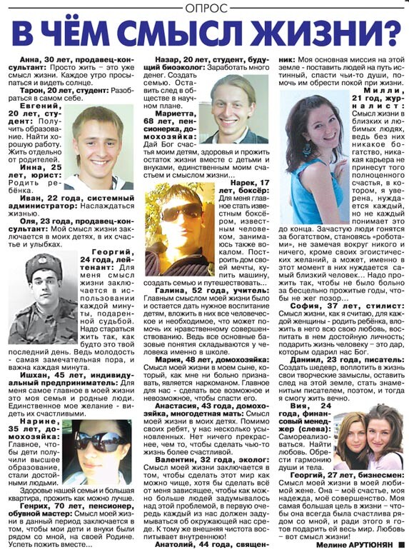Смысл жизни разный для людей разной ценностной направленности. Смысл жизни для Потребителя: «Удовлетворение всех потребностей». Смысл жизни для Паразита: «Все на халяву!». Смысл жизни для Романтика - «То, ради чего я готов умереть». Смысл жизни для Творца: «То, ради чего я готов трудиться, чтобы это стало». Смыслы жизни людей с высоким уровнем культуры, энергии, фантазии и интеллекта могут стать смыслами жизни и для других людей.