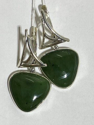Завальцованный натуральный нефрит, длинные серьги и рваный край фактурного серебра.