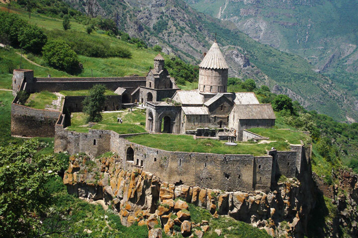 Татевский монастырь - армянский монастырский комплекс конца IX—начала X веков, находится в горах Зангезура Сюникской области Армении, на расстоянии в 20 км от города Горис. Дорога, ведущая к Татеву, проходит через сильно пересеченную местность и глубокое ущелье, по которому протекает бурная горная река Воротан. Монастырь расположен на обрыве глубокого ущелья и окружен толстыми крепостными стенами. Замечательный горный пейзаж придает всему комплексу монастырских зданий, повисших на утесе, характер мощи и величия.