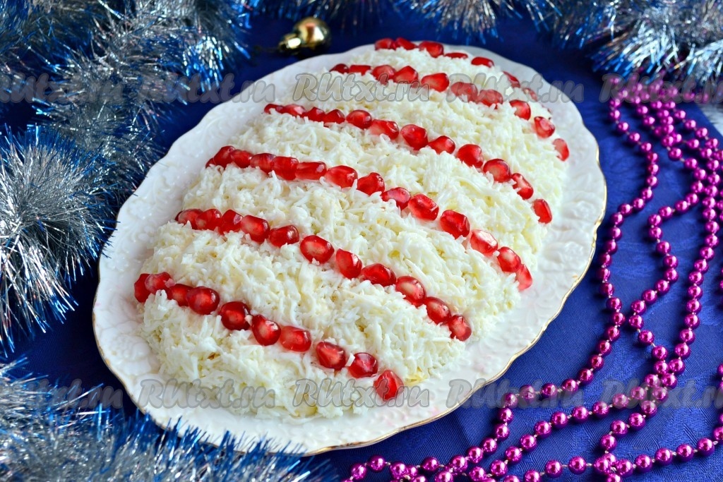- Последним слоем выложить натертые на средней терке белки. Белками нужно покрыть салат полностью. Майонезом не смазывать.