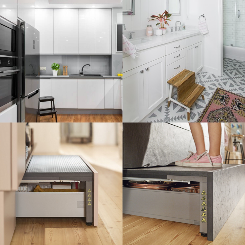 Один из недостатков кухонных шкафов до самого потолка — это сложность использования верхних полок. Дотянуться до верха не помогает даже высокий рост. Впрочем, даже до обычных шкафов не все могут дотянуться. Одно из решений такой проблемы это использование стула. Но со стула можно легко упасть, ведь он сам по себе не очень то устойчив. Поэтому для этих целей обычно используется табурет-лестница.