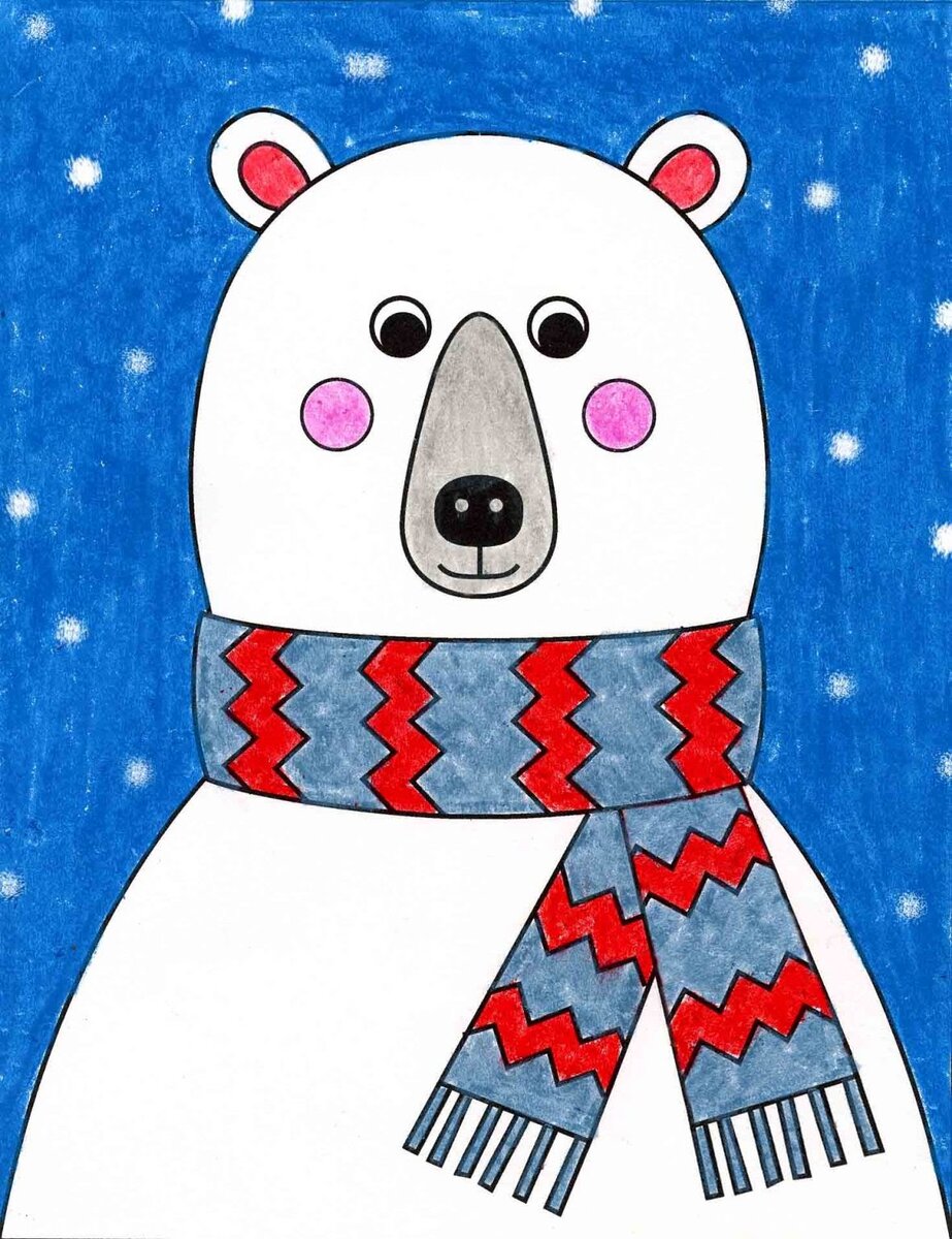 Следуя поэтапному уроку, ребёнок с любыми навыками рисования создаст симпатичный рисунок. Творцы продвинутого уровня смогут изменить цвет шерсти или шарфа, а может даже поменять время суток на картине.
