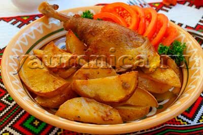 Проверяем готовность курицы. Вилкой слегка накалываем. Она должна входить свободно, а сок, который появится, должен быть прозрачным. Картофель приобретет золотистый оттенок.