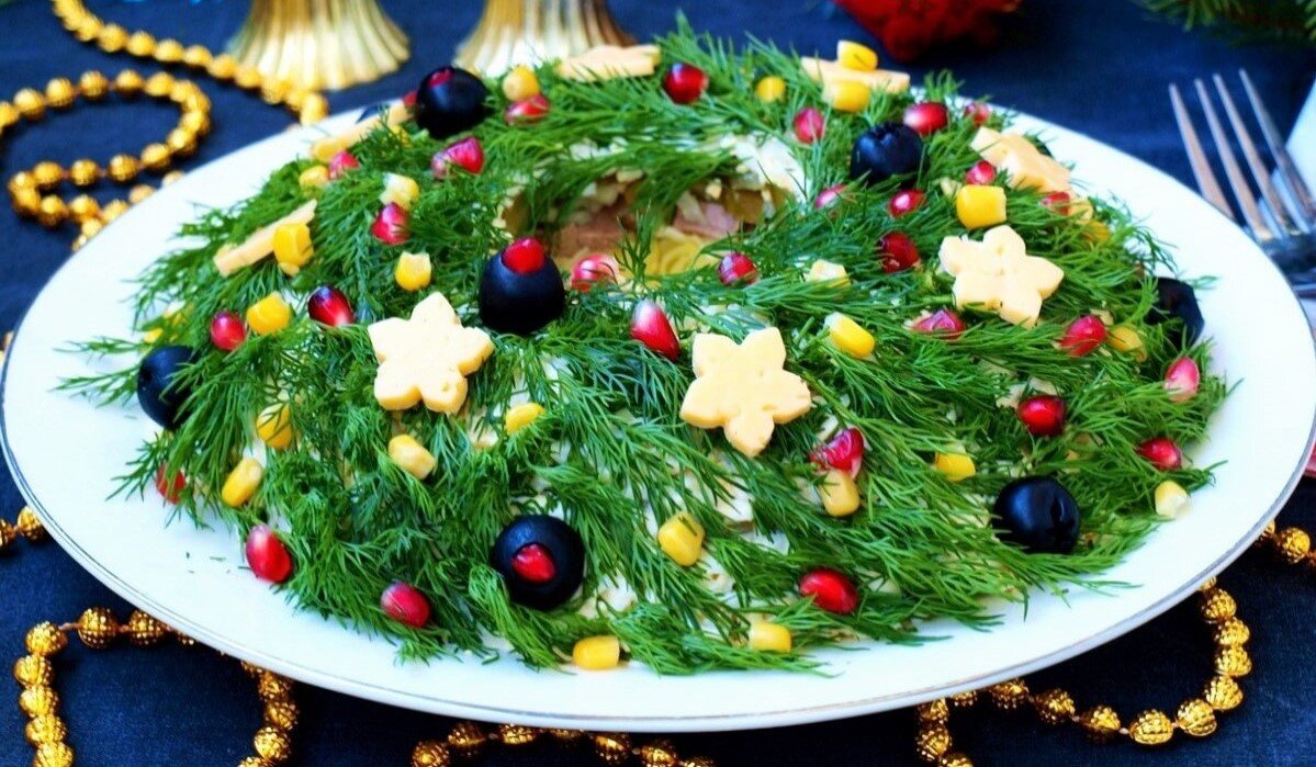 4) Оформляем салат: изобразите венок с помощью веток укропа. Из сыра вырежьте аппетитные звездочки, разложите их сверху вместе с консервированной кукурузой, маслинами и зернами граната. Аккуратно уберите стакан.