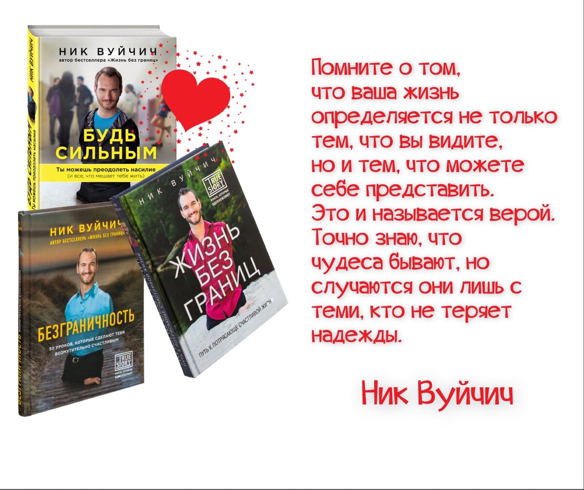 ✍🏻 «У каждого времени свои герои. В детстве сверхчеловеком я считал безногого летчика Алексея Маресьева. Потом пришла эпоха героев выдуманных - суперменов из комиксов. А теперь у нас есть Ник, который раздвинул возможности человека до немыслимых пределов». (Игорь Елков, обозреватель «Российской газеты») 📖 Почти каждый из нас в разное время своей жизни в отчаянии задается вопросом: «Господи, за что мне все это?». Причин множество – от поломки машины и сына-двоечника до тяжелой болезни... Ник Вуйчич, которому сегодня исполнилось 48 лет, родился без конечностей – ручки и ножки у ребенка отсутствовали, имелся лишь коротенький отросток на месте одной ноги с несформированными пальчиками. Маленький Ник жил и развивался вопреки всему: его держала на плаву беспримерная любовь родителей. Не раз он обращался к небу с неизбежным сакраментальным вопросом… Такого примера борьбы с самим собой, пожалуй, не было в нашей истории. В это очень-очень сложно поверить, но Ник Вуйчич победил: отрос