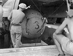 Бомба «Fat Man» в инертном снаряжении в момент загрузки в бомбоотсек B-29 для отработки приёмов бомбометания, 1945.