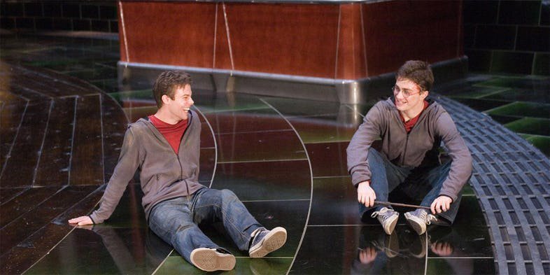 А вот нырять Рэдклиффу всё-таки пришлось научиться самому. Впрочем, вместо опасных гриндилоу под водой его ждали сразу несколько водолазов, готовых в любой момент помочь этому мальчику выжить ещё раз. Да и само озеро вовсе не выглядит таким мутно-зелёным, как на экране в «Кубке огня». Синий цвет фона был нужен для добавления компьютерных эффектов.