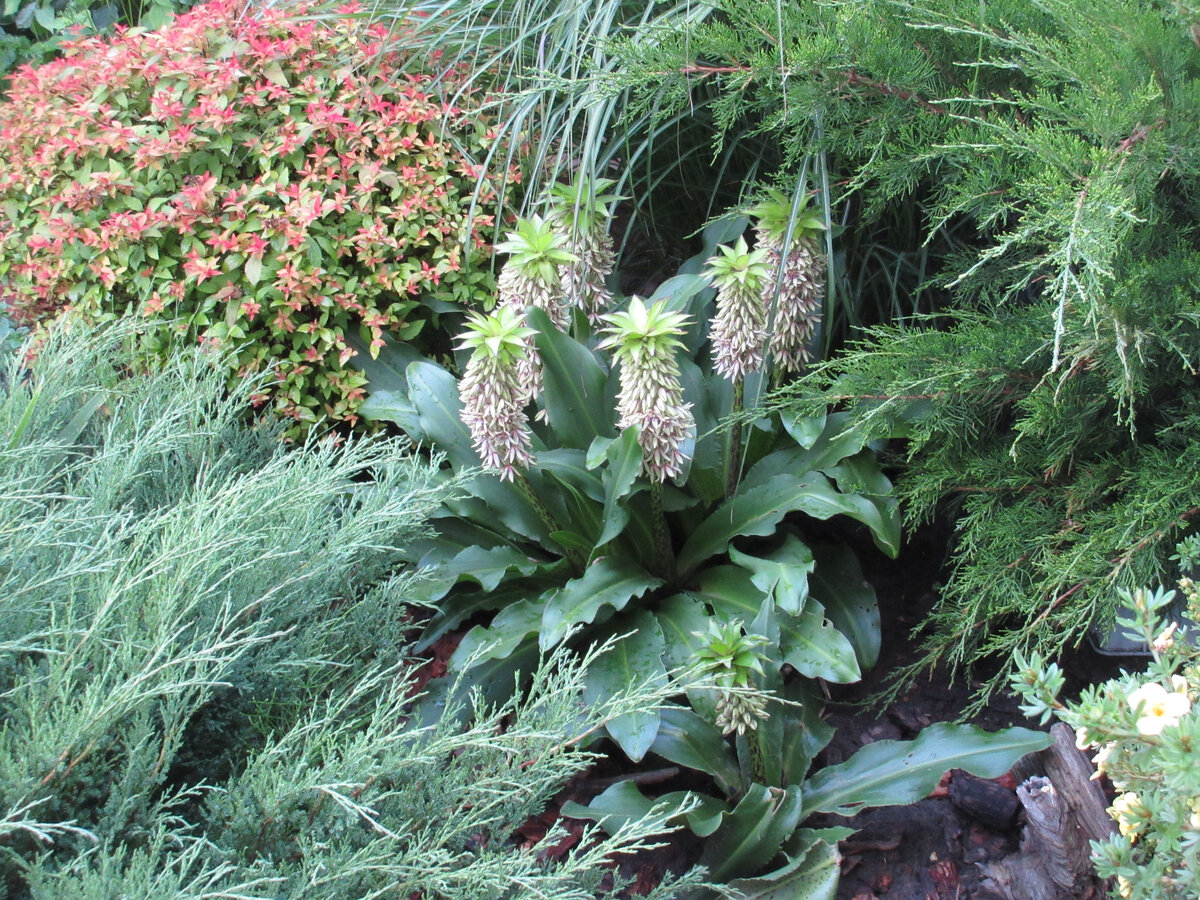 На мой взгляд, эукомисы весьма декоративны. Причем, их декоративность имеет довольно длительный период и не снижается в течении всего лета. Одно только цветение иногда длится более двух месяцев! Но и после цветения они остаются привлекательными до глубокой осени. Они не раздражают меня увядшими соцветиями, а тем более желтеющей листвой, как например, те же тюльпаны или безвременники. Поэтому их смело можно высаживать куда-то в парадную зону, чтобы были, как говорится, на виду. Не подведут! Лично мне нравится сочетать их с хвойными и злаками, в частности с мискантусами.