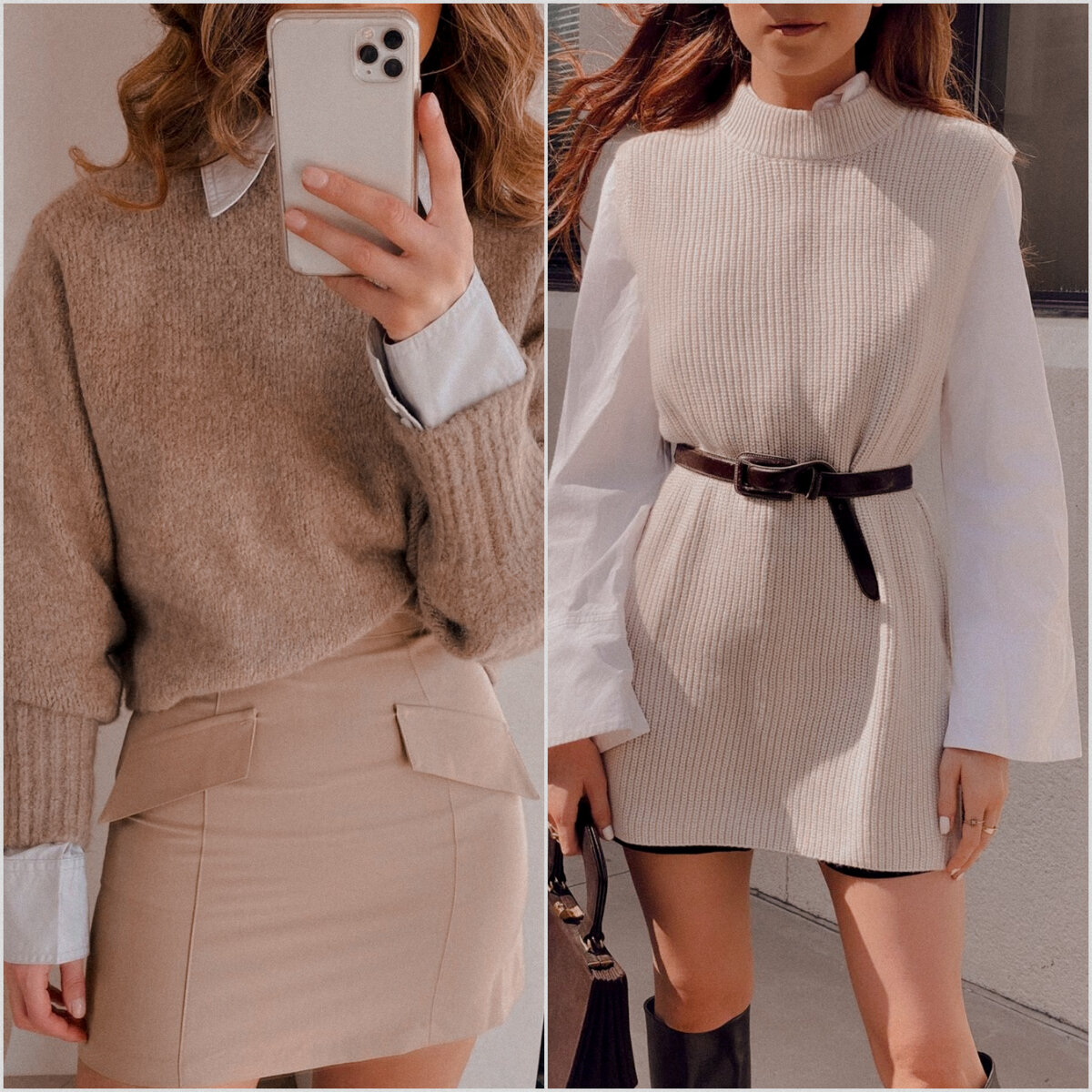 Сочетайте объемный трикотаж с обтягивающей мини-юбкой, так вы создадите нужную гармонию. Лучше всего если образ будет выдержн в нейтральных оттенках, так он будет выглядеть дороже.