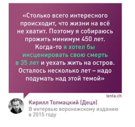 Очень жаль, что он не услышал этих слов от своего отца. Очень жаль, что так желал его признания. Всего лишь надо было даровать себе право признать себя самому. Кирилл не отделился в отдельную личность и жил маминой обидой на отца. Мать, то пишет поздравление с днём рождения бывшему мужу и фразы "спасибо за сына", то выкладывает отрывки интервью толмацкого старшего, где он нелестно отзывается о сыне, и мусолит кучу неприятных вещей.