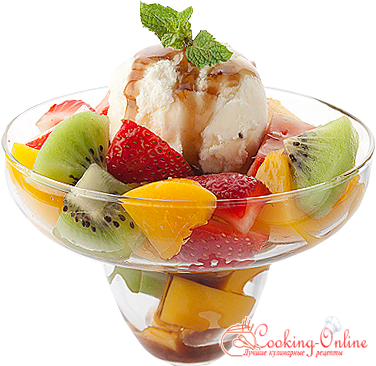 В креманку выложить фрукты, сверху выложить шарик мороженного и добавить сироп!!!