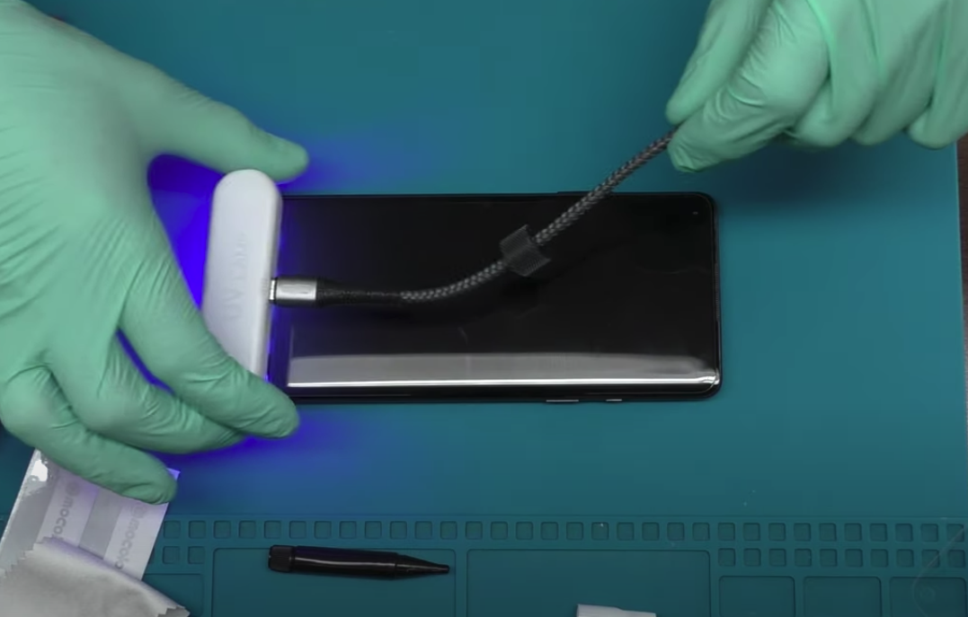 Изображение сверху - процесс оклейки стекла на ультрафиолетовый клей. Делается это всё довольно сложно, необходимо как минимум находится в защитном костюме и делать это всё с особой острожностью.