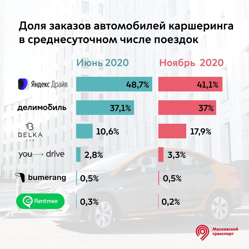 В конце июня на поездки в автомобилях каршеринга окончательно сняли ограничения. Так изменилась доля заказов в сутки с июня до ноября среди главных операторов города⬆️