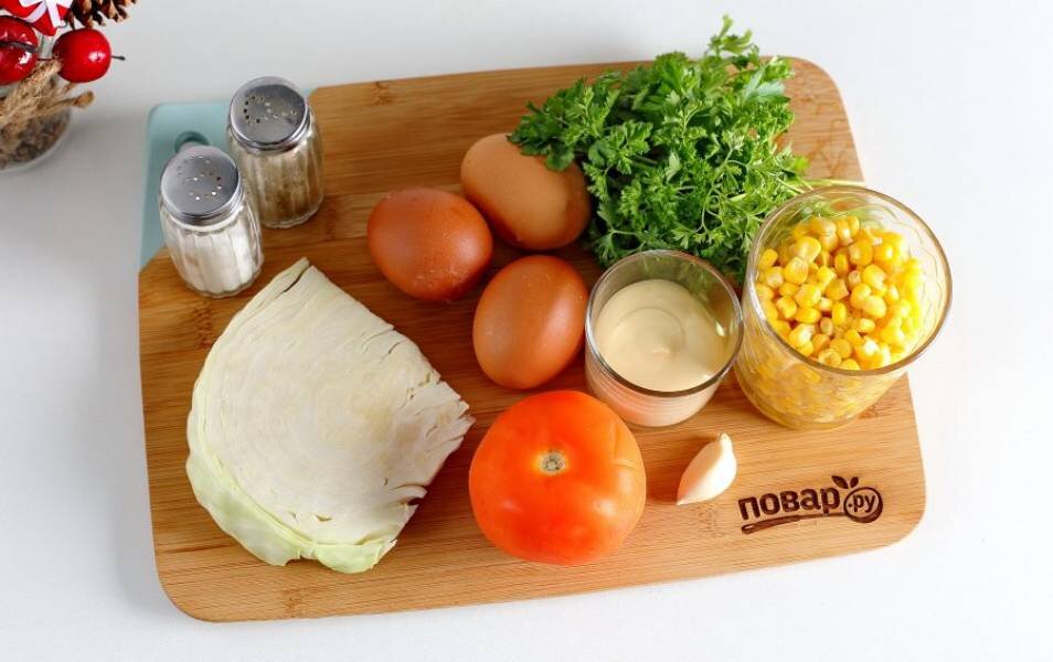 Яйца сварите вкрутую. Одно яйцо оставьте для украшения, а оставшиеся очистите, нарежьте кубиками и добавьте к капусте.